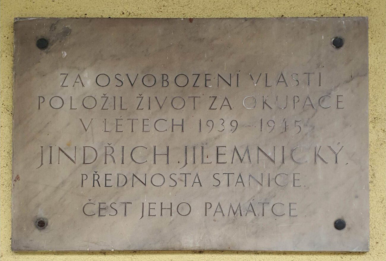Pamětní deska připomínající padlé železničáře se nachází pod střechou verandy na staniční budově.